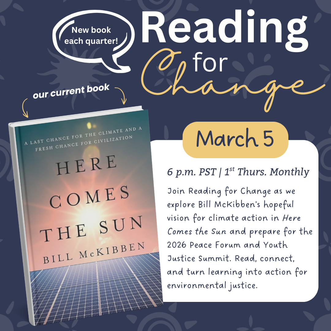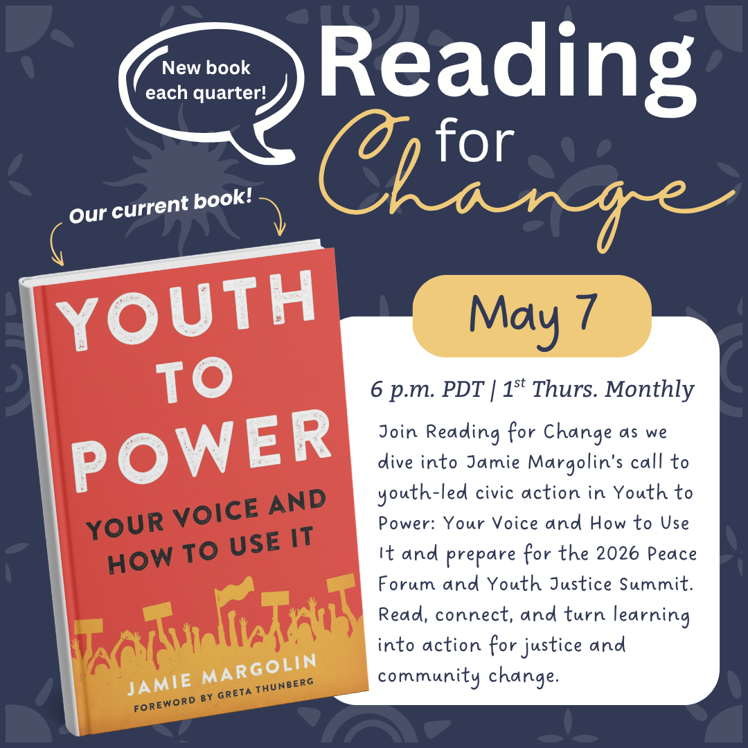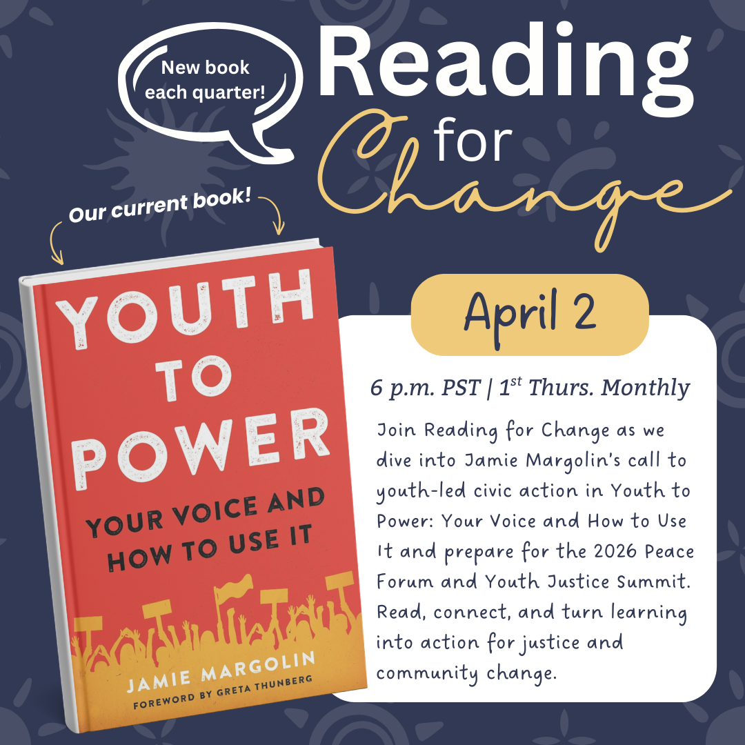 Welcome to Reading for Change! This is an expansion of Love Out Loud in which we will read quarterly books that will culminate in connecting with an organization that supports the mission of the book. We meet at 6:00 p.m. PST on the 1st Thursday of each month.