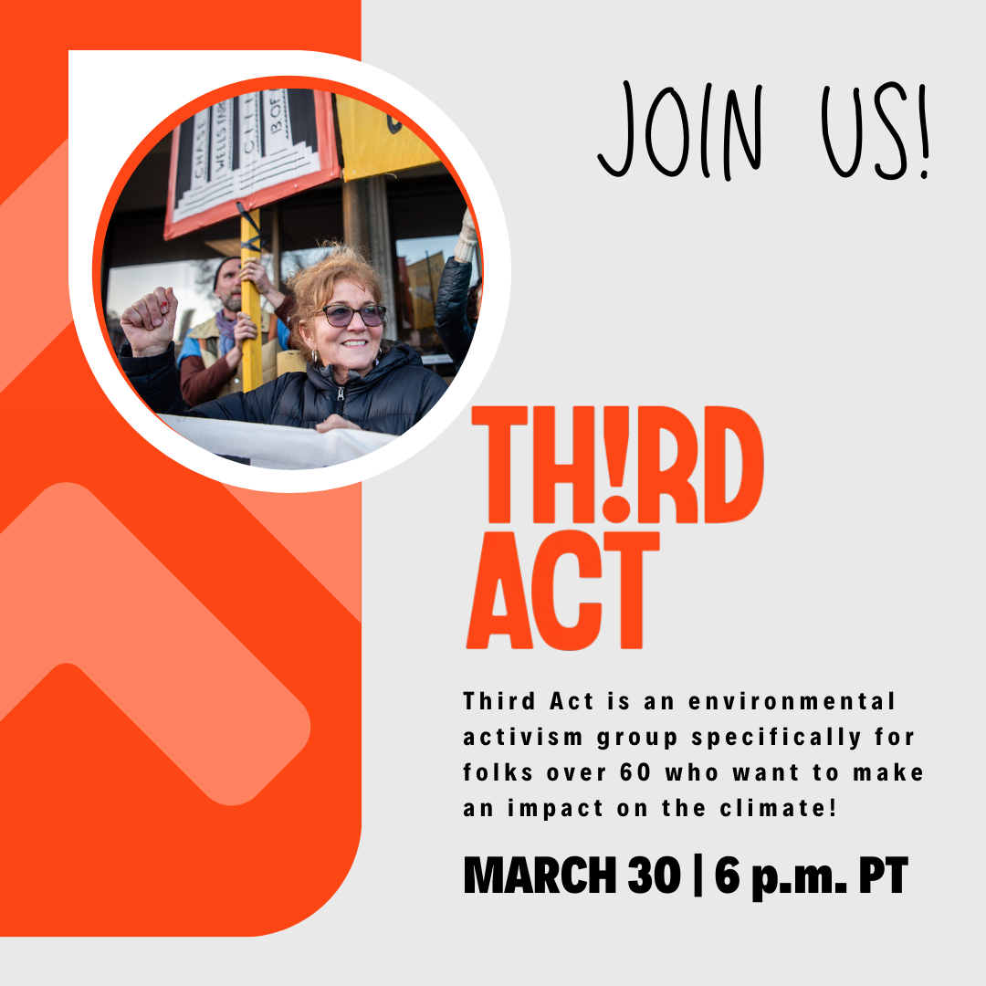 Join us March 30th at 6:00 PM Pacific Time on Zoom to hear from Third Act – an environmental activism group specifically for folks over 60 who want to make an impact on the climate!