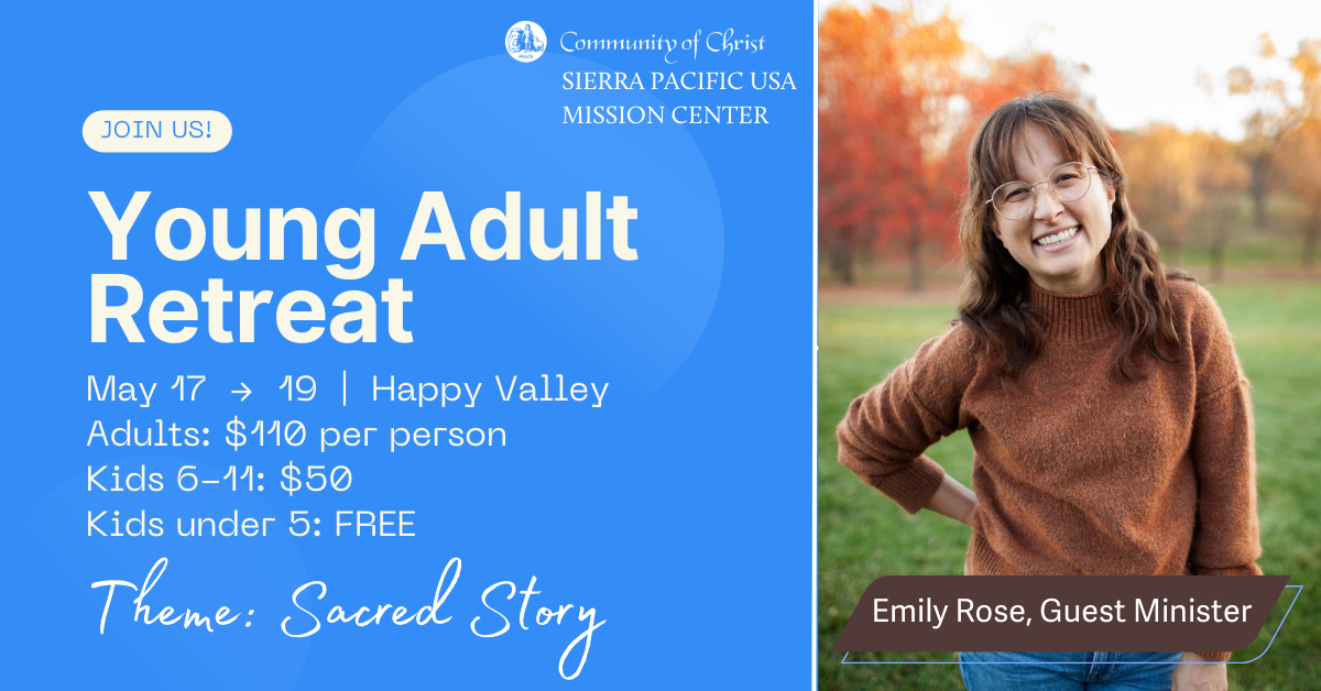Young Adult Retreat Friday, May 17, 2024 4:00 PM Sunday, May 19, 2024 12:00 PM Google Calendar ICS 🗓️ May 17 - 19, 2024📍Happy Valley Conference Center💵 $110/adult (Children 6-11 = $50 / children ≤5 = free)Join us for a lovely Young Adult weekend with our guest, Emily Rose, and a ropes course on Saturday. We’ll enjoy dinner at Happy Valley when you arrive with a make-n-take lunch on Sunday morning. VIEW SCHEDULE REGISTER